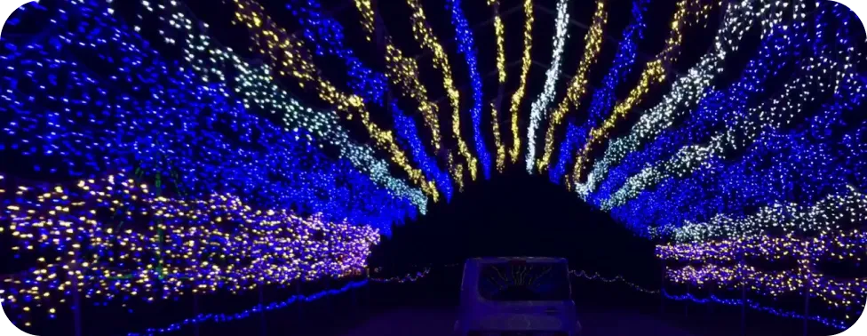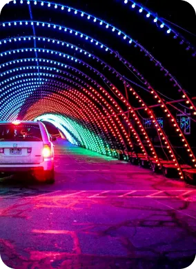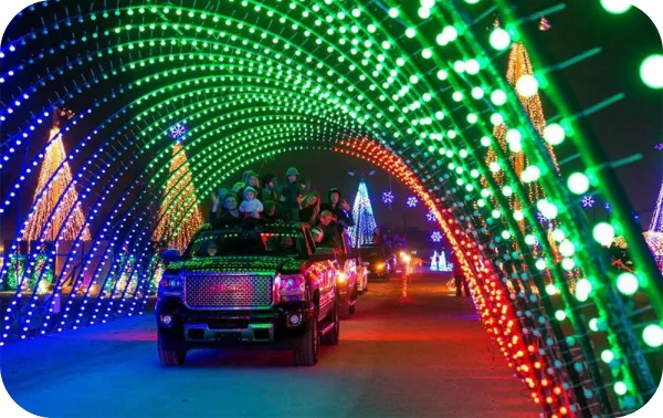 Drive through breathtaking illuminated tunnels with over 200,000 twinkling lights synchronized to festive holiday music.